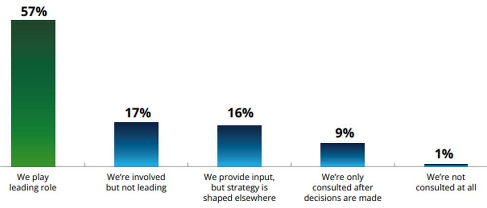 Deloitte’s research confirms that 57% of finance leaders now say they play a leading role in shaping organisational strategy, while only 1% are not consulted at all on strategy decisions. This represents a fundamental inversion of the traditional finance mandate. Where CFOs once guarded the rear-view mirror, they now design the navigation system.